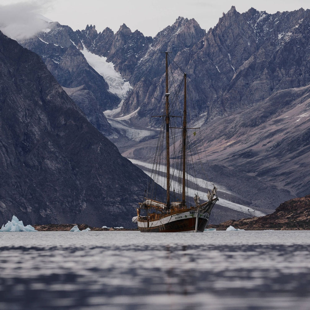 Das kleine Holzboot, umgeben von Eisbergen, war eine Woche lang unser Zuhause. Acht Teilnehmer und vier Crewmitglieder.