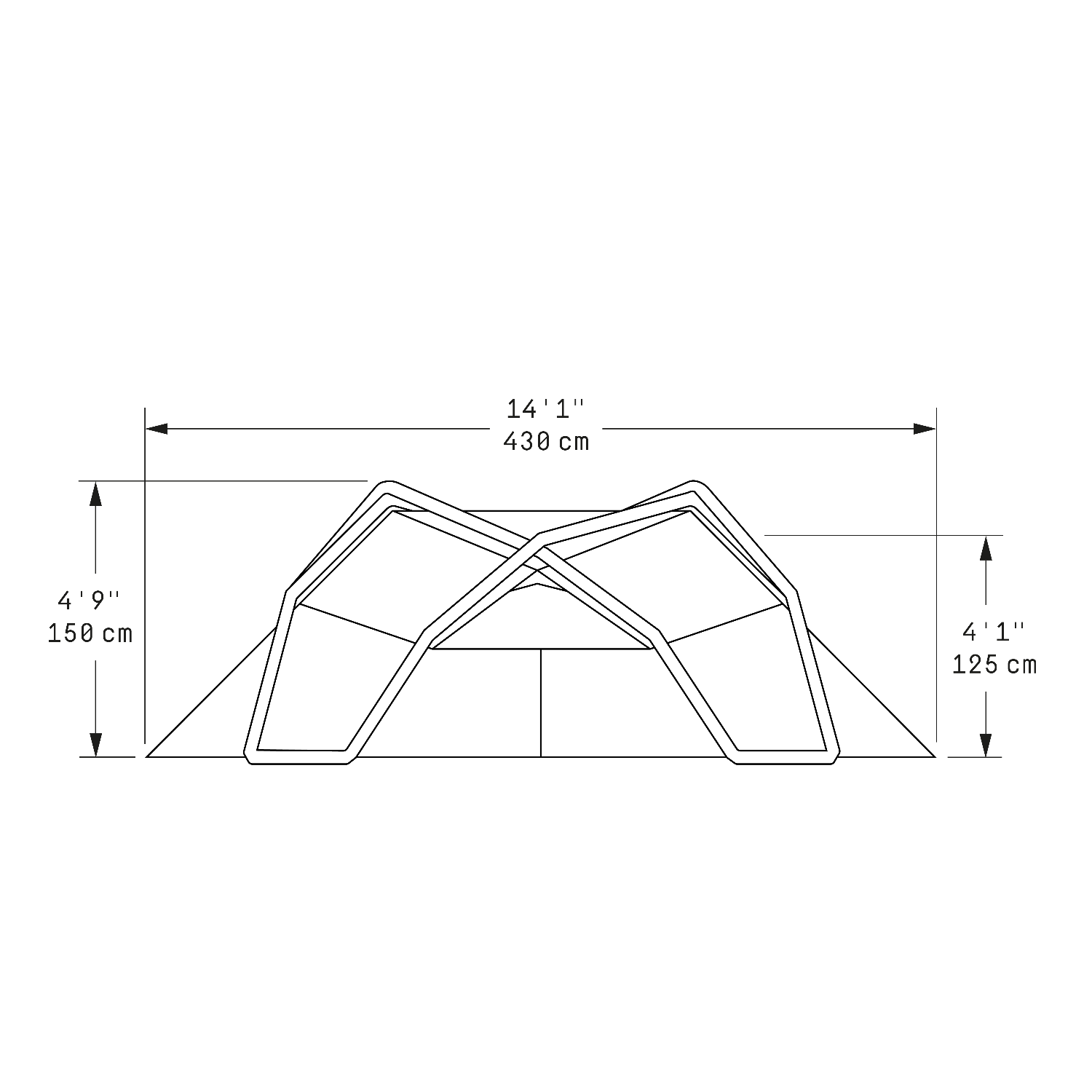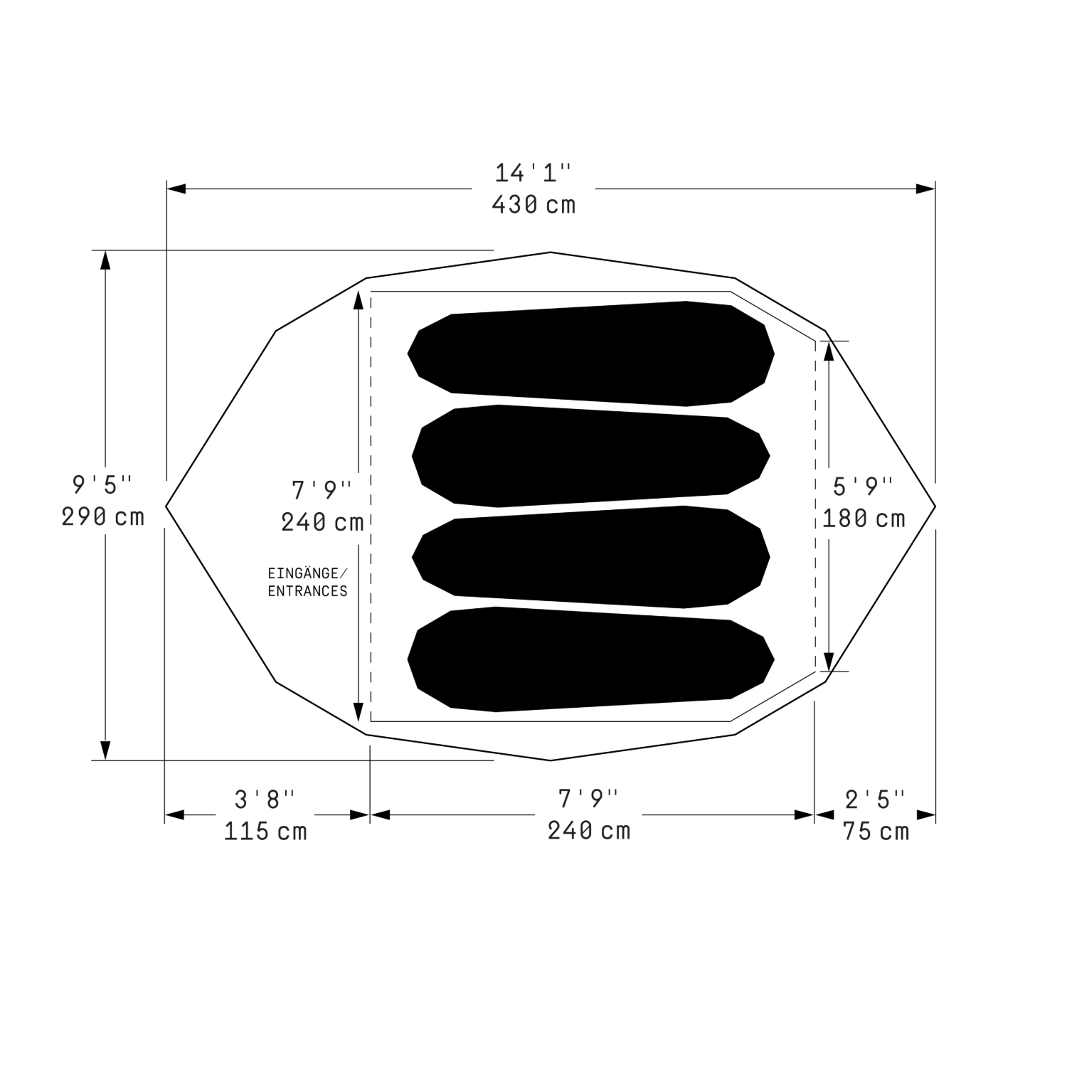Die Höhe des Außenzeltes kann sowohl von innen als auch von außen an beiden Seiten des Zelts verstellt werden. Zusammen mit den verschließbaren oberen Belüftungssystemen kann so die Luftzirkulation nach Bedarf angepasst werden. Für maximale Belüftung könnten zu dem die zwei Eingänge des Außenzelts geöffnet werden.